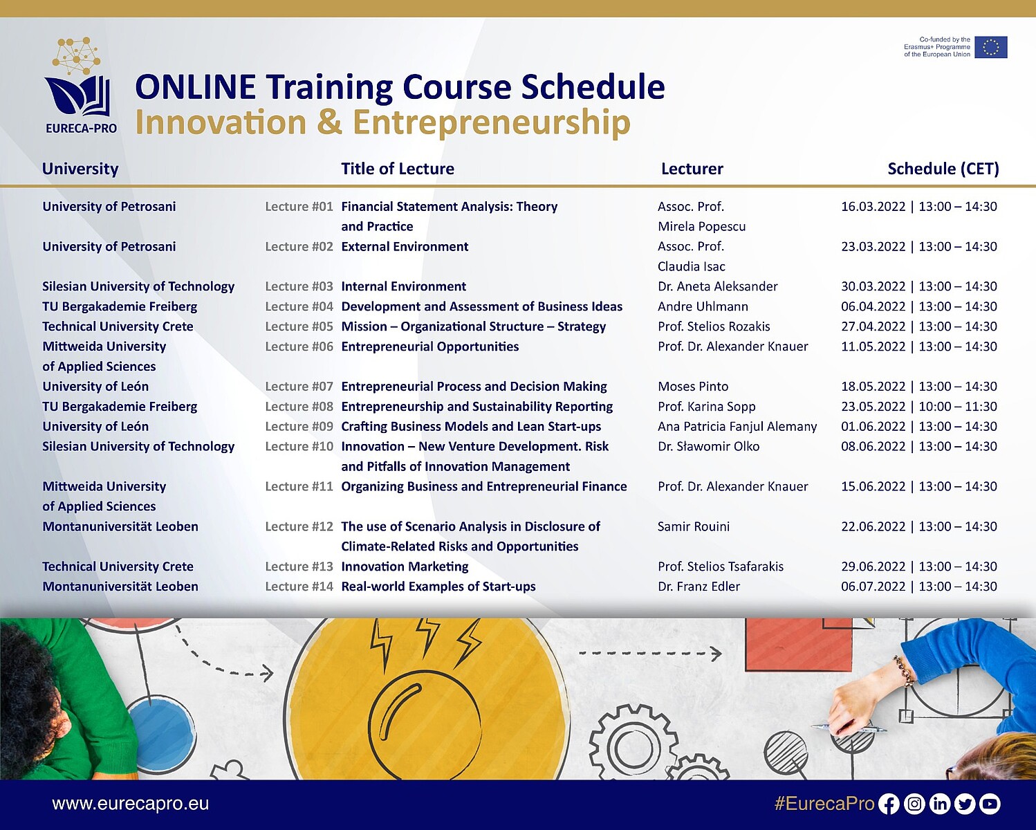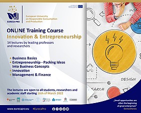 The Technical University of Crete, in the context of EURECA-PRO, the European University on Responsible Consumption and Production, organizes a free online course on "Innovation & Entrepreneurship", consisting of a series of 14 lectures presented by leading professors and researchers of seven European universities from six countries. The main purpose of the "Innovation and Entrepreneurship training course" is to nurture students and scientific staff in creative and innovative thinking by providing practical knowledge, skills and competences in business and market basics, offering business plan orientation, and promoting problem-solution thinking and leadership skills. The following thematic areas will be covered: