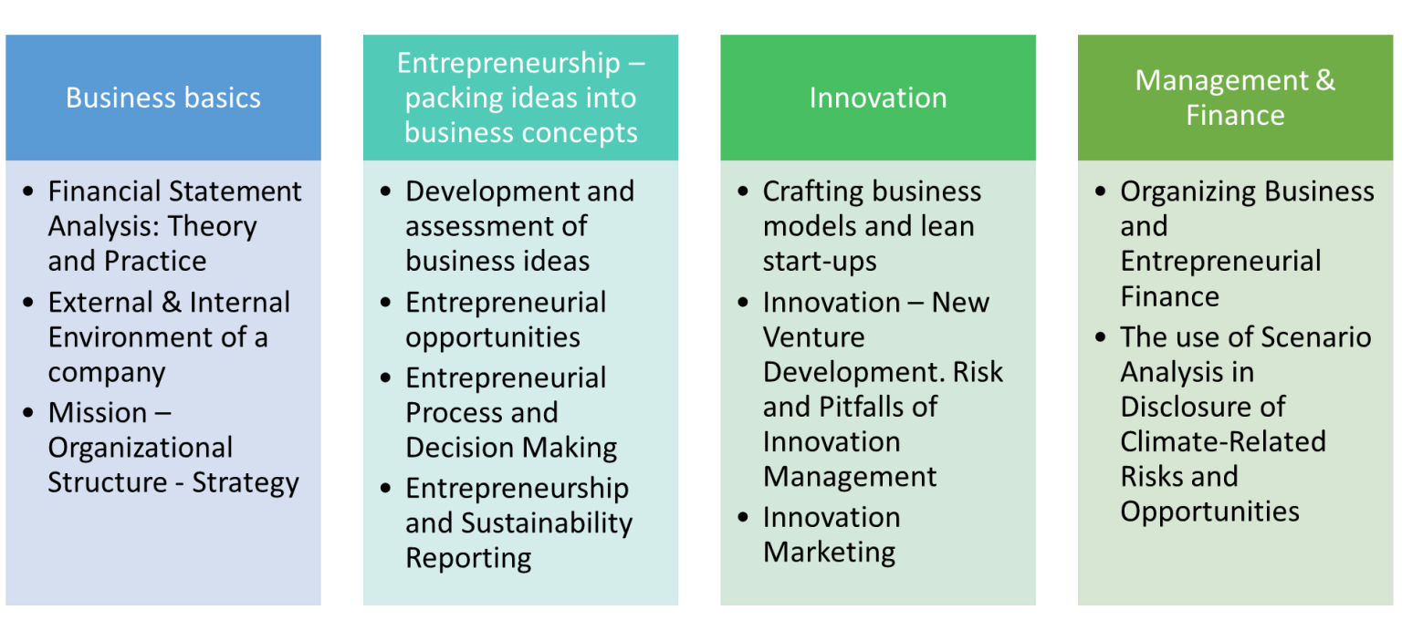 - Entrepreneurship - packing ideas into business concepts